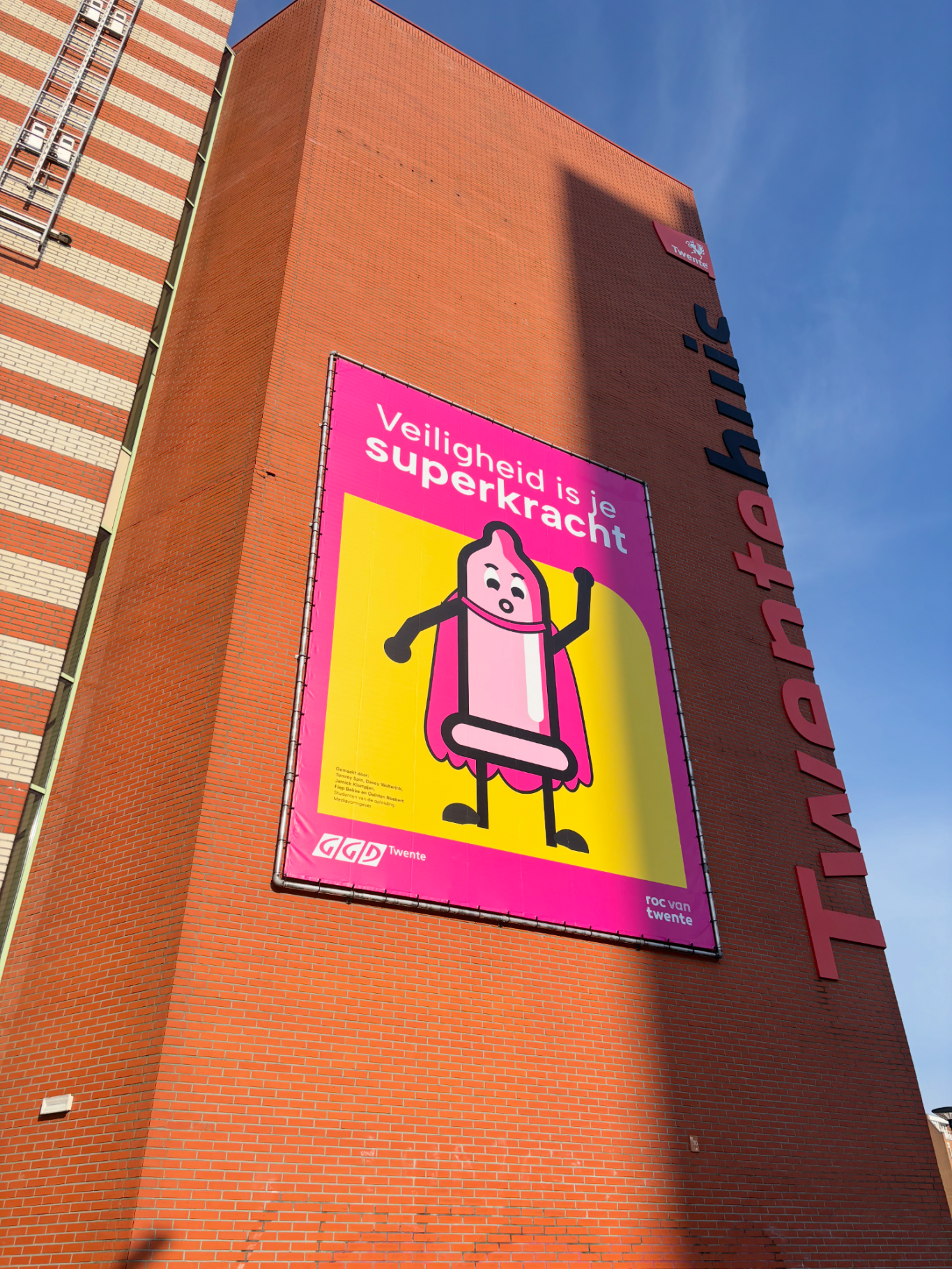 In een projectweek van mijn opleiding hebben we de opdracht gekregen van GGD Twente om een campagne omtrent condoomgebruik te maken. We maakten dit in groepsverband, we hebben met elkaar een stijl bedacht en zijn deze gaan uitwerken. Hier zie je de reeks van ontwerpen voor Instagram die ik heb vormgegeven. Mijn kant van het ontwerp is de plaatsing en kleur die je ziet. Uiteindelijk zijn wij als winnaar uit de bus gekomen en is GGD onze campagne gaan gebruiken om het condoomgebruik onder jongeren te stimuleren. Met als resultaat een enorm doek aan het TwenteHuis in Enschede!